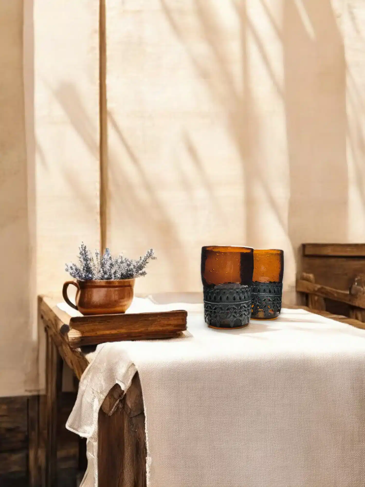 Chaque verre commence comme du verre post-usage collecté en Égypte, transformé par des artisans grâce à des techniques traditionnelles de soufflage à la bouche.