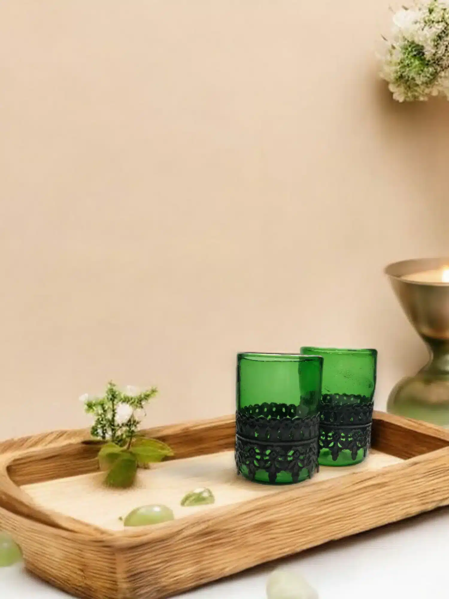 Un ensemble de deux verres, soufflés à la bouche en verre recyclé et ornés d’un motif raffiné, texturé – à la fois visuellement saisissants et agréables en main.