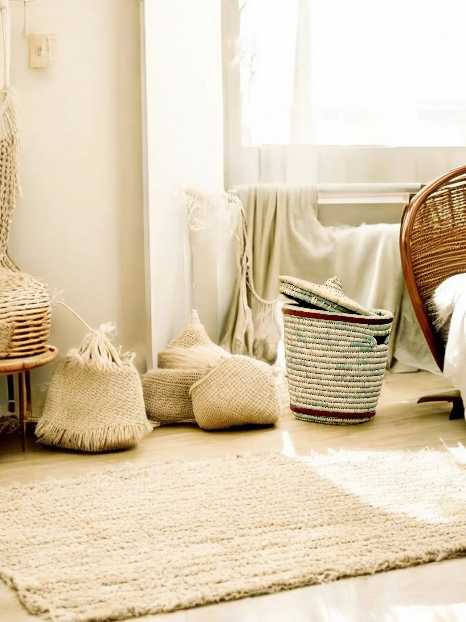 Crafted from dried palm in soft beige tones, the basket is lightweight yet sturdy, with a tall, conical shape for maximum capacity.