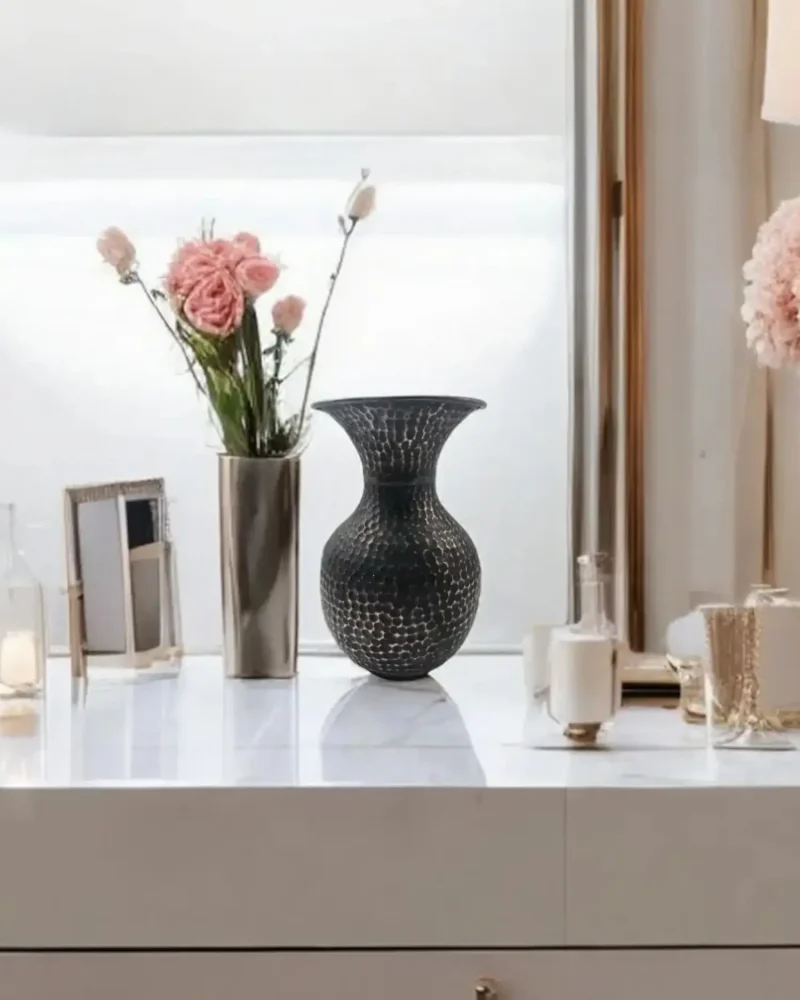 The Damask vase blends raw craftsmanship with refined form. Its distinctive neck and textured body make it a versatile centerpiece in minimalist, rustic, or contemporary interiors.