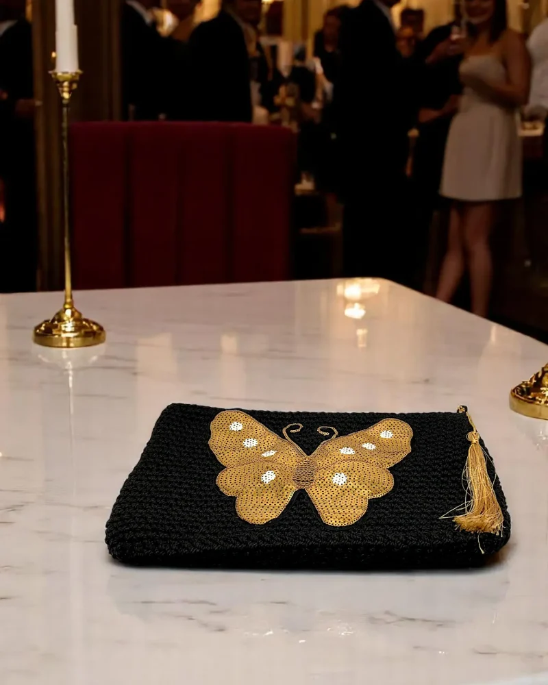 A deep black base with a sequin butterfly in shimmering gold — designed to turn heads with just the right touch of sparkle.