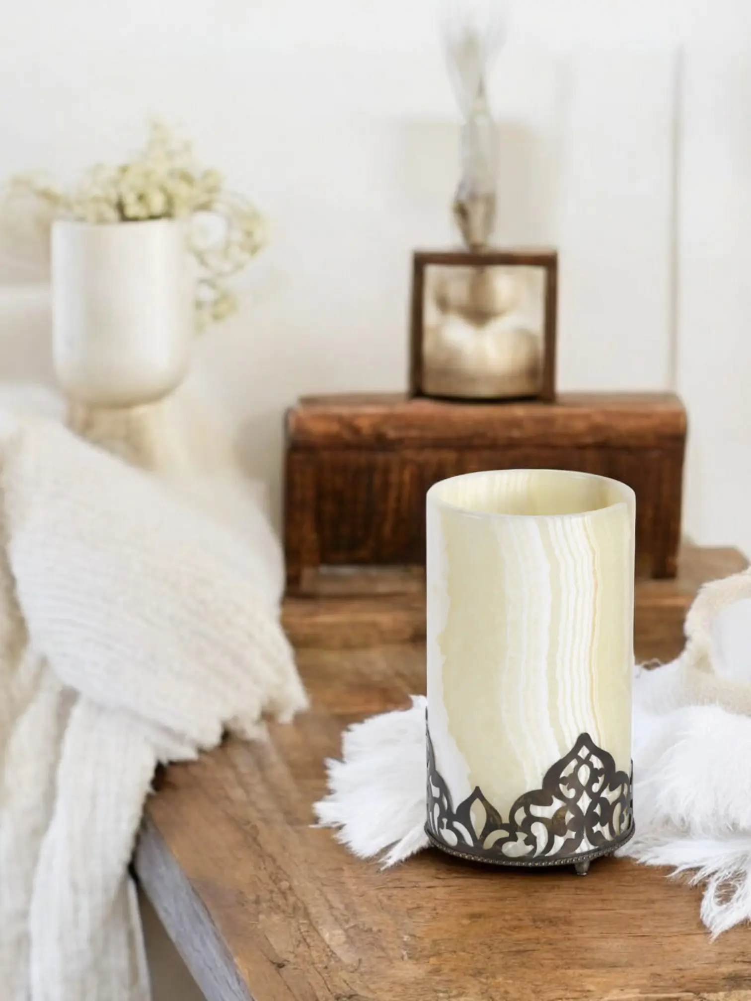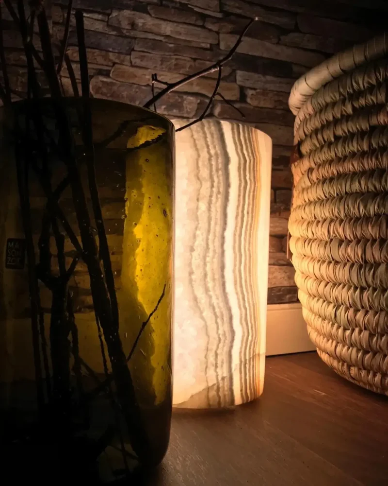 Crafted from translucent alabaster with elegant, earthy striations — each lamp is naturally unique.