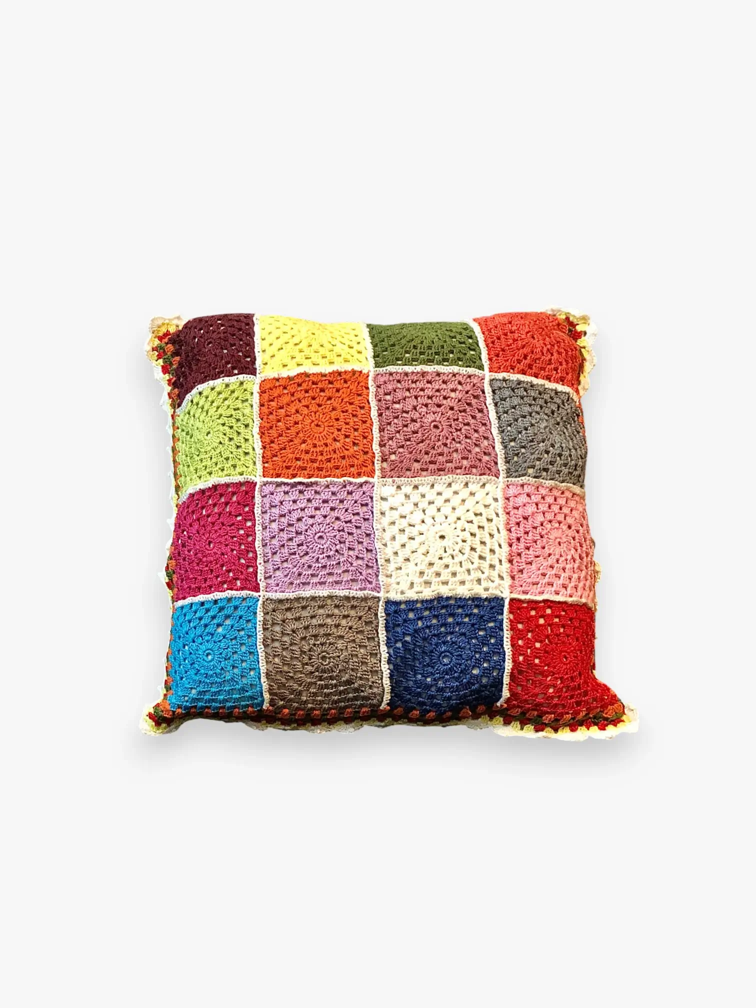 The patchwork of granny squares is arranged in a joyful mix of tones, creating a colorful, eye-catching accent.